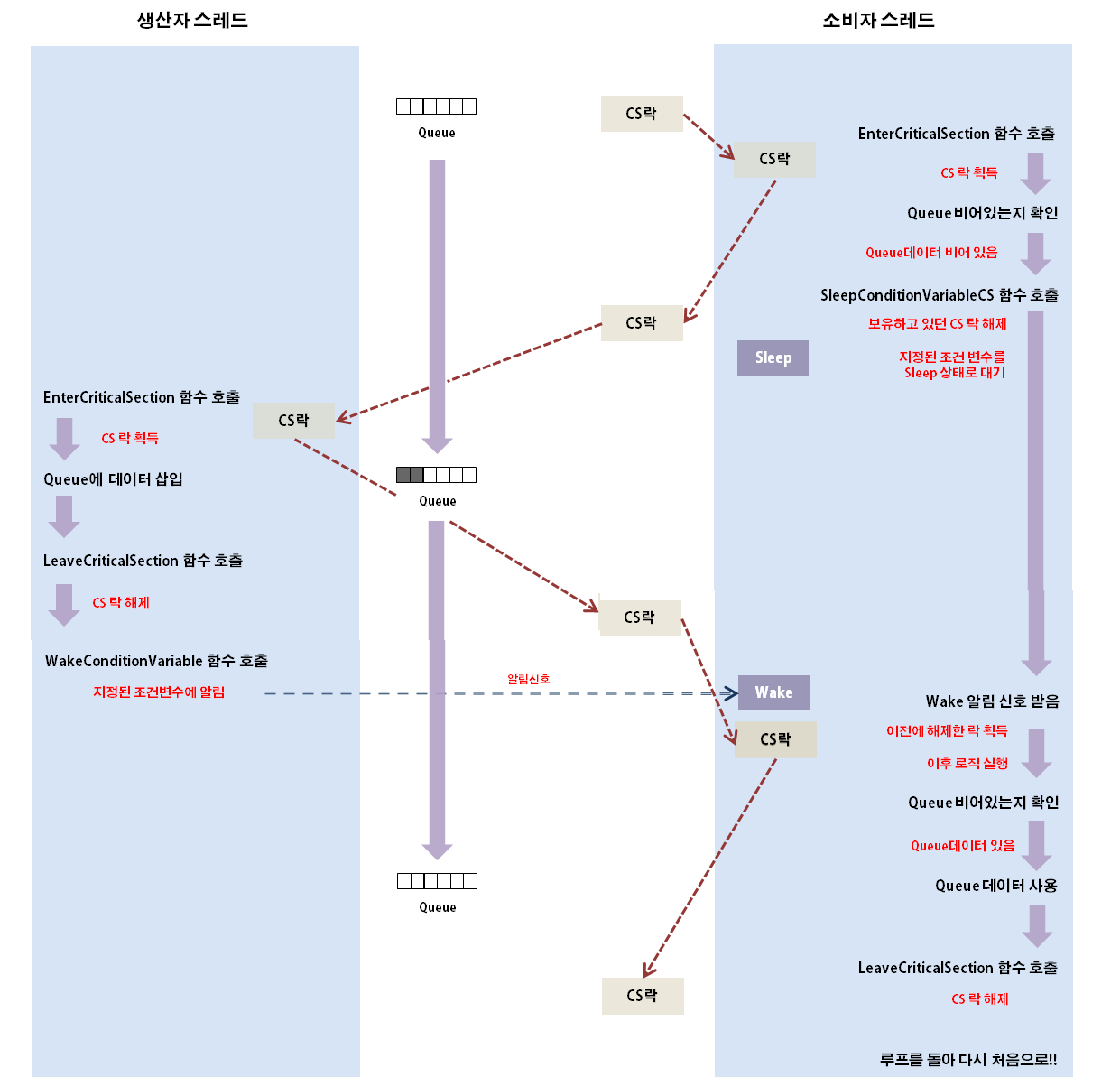 (예제에서는 SleepConditionVariableCS 함수에서 깨어난 후 TestPredicate 함수를 또 체크합니다.))