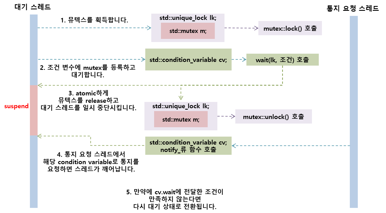 condition_variable을 통해서 대기하려는 스레드들은 다음과 같은 동작을 수행합니다.