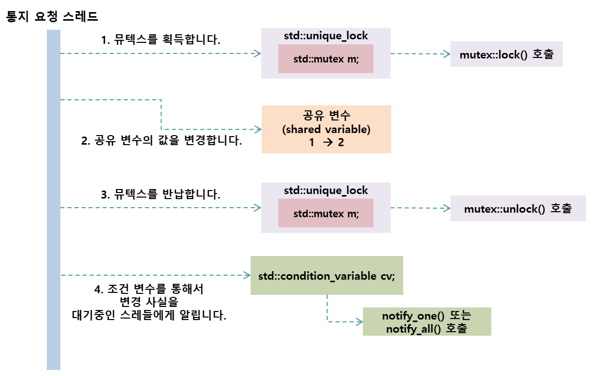 - std::condition_variable의 notify_one또는 notify_all을 실행 합니다.